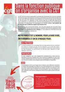 Se syndiquer à la CGT, la construire et la renforcer en proposant l’adhésion autour de soi, participer à la campagne des élections de la fonction publique en se portant candidat et en faisant voter CGT, permettra de construire le rapport de force nécessaire pour porter nos revendications légitimes et changer les choses :